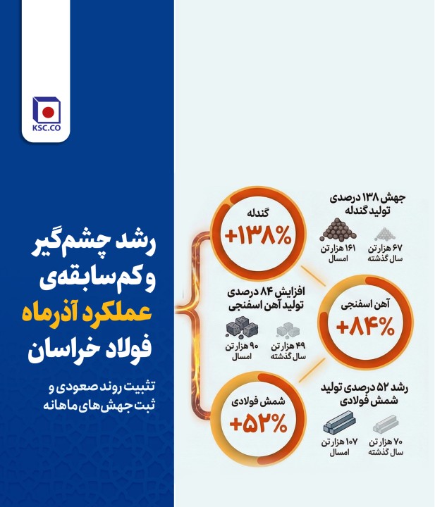برآیند آمار تولید 9 ماهه و جهشهای ثبتشده در آذرماه نشان میدهد مجتمع فولاد خراسان با اتکا به مدیریت موثر تولید و پشتیبانی، انسجام عملیاتی و سرمایه انسانی متخصص خود، توانسته است مسیر رشد تولید را در بخش عمدهای از زنجیره تثبیت کند؛ مسیری که تداوم آن، زمینهساز تحقق اهداف تولیدی، افزایش تابآوری عملیاتی و ارتقای جایگاه این شرکت در صنعت فولاد کشور خواهد بود.