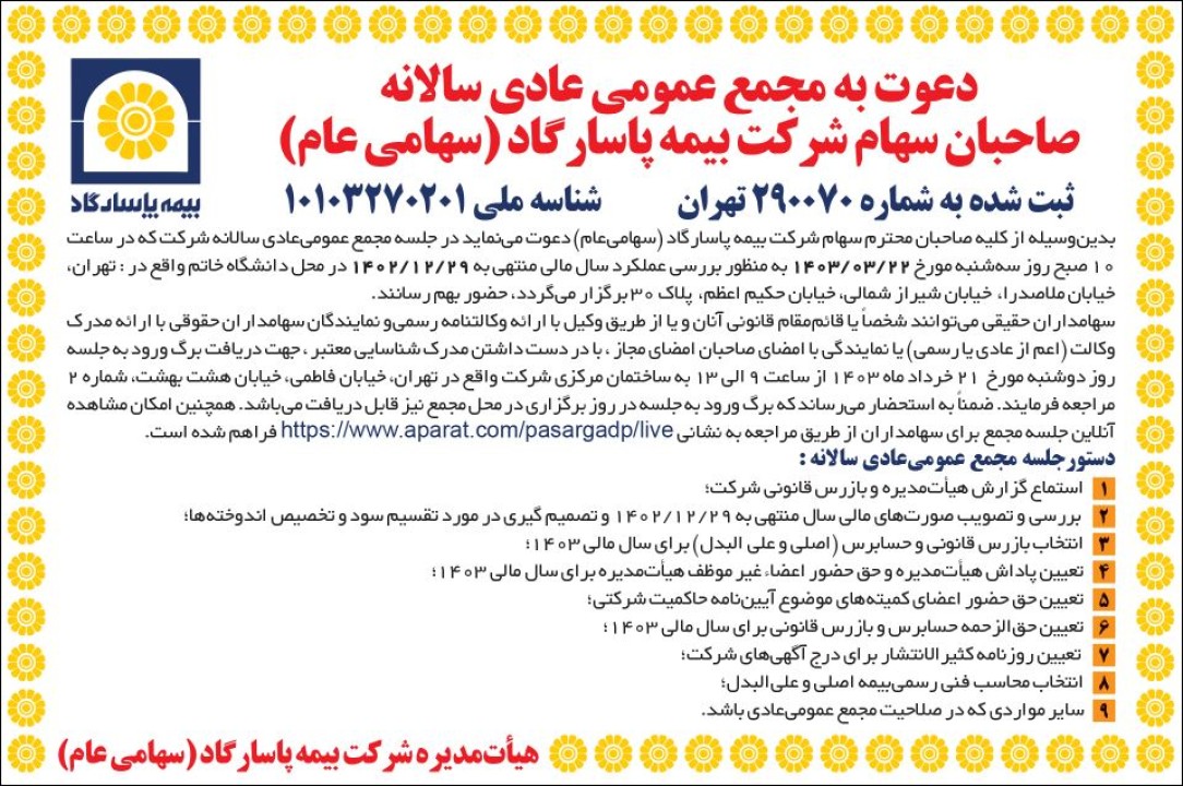 بدینوسیله از کلیه صاحبان محترم سهام شرکت بیمه پاسارگاد (سهامی عام) دعوت می نماید در جلسه مجمع عمومی عادی سالانه شرکت که در ساعت 10 صبح روز سه شنبه مورخ 1403/03/22 به منظور بررسی عملکرد سال مالی منتهی به 1402/12/29 در محل دانشگاه خاتم واقع در : تهران ، خیابان ملاصدرا ، خیابان شیراز شمالی ، خیابان حکیم اعظم، پلاک 30 برگزار می گردد ، حضور بهم رسانند.