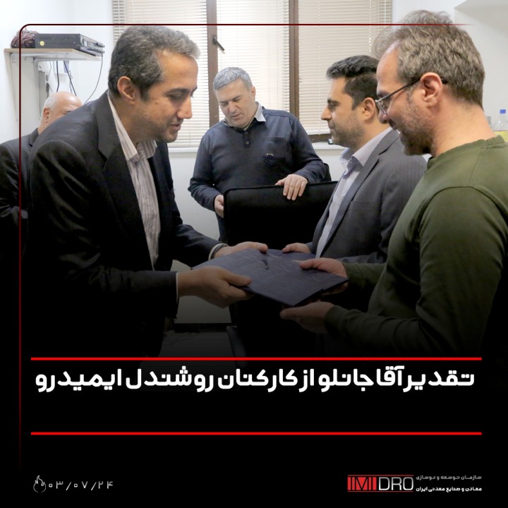 سرپرست ایمیدرو صبح امروز به همراه فرداد امیر اسکندری معاون مالی و اقتصادی و محمدرضا گودرزی مدیر آموزش، پشتیبانی و منابع انسانی سازمان توسعه و نوسازی معادن و صنایع معدنی ایران با حضور در محل کار این همکاران، با اهدای لوحی از زحمات و فعالیت آنان تشکر کرد.