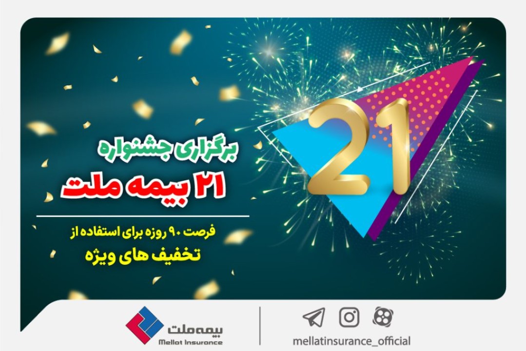 شرکت بیمه ملت به مناسبت بیست و یکمین سالگرد تأسیس خود، جشنواره ۲۱ را برگزار میکند. کلیه هموطنان عزیز میتوانند از مزایای جشنواره شامل تخفیفات ویژه برای صدور یا تمدید بیمهنامههای خود استفاده کنند. در این جشنواره بیمه ملت تخفیفات ویژهای در بیمههای آتش سوزی، حوادث انفرادی، مسئولیت و بدنه اتومبیل تخصیص داده است.