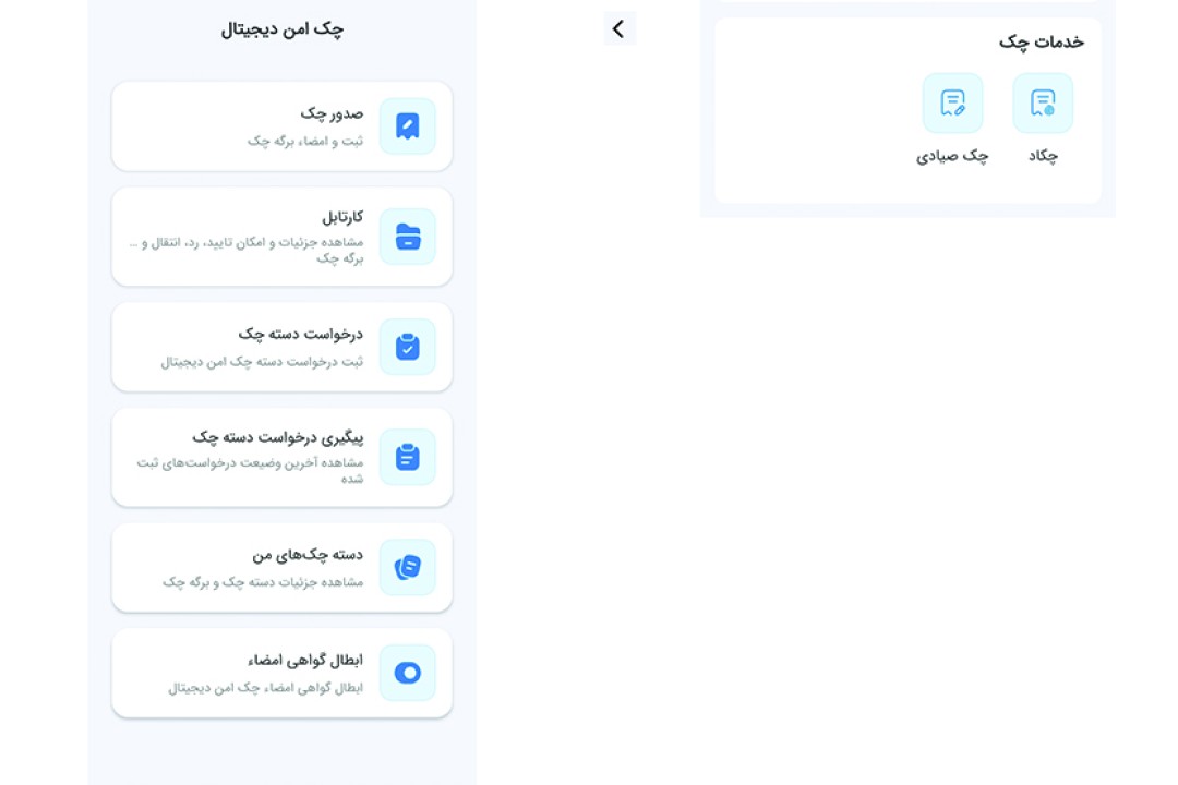 در این بخش گجت های مختلفی برای مدیریت دسته چک نظیر ثبت درخواست دسته چک، مشاهده نتیجه عملیات، تایید اطلاعات، پیگیری درخواست، مشاهده آخرین وضعیت ، صدور دسته چک، انتقال برگ چک، عودت چک و ثبت گواهی امضای دیجیتال قابل ملاحظه است.