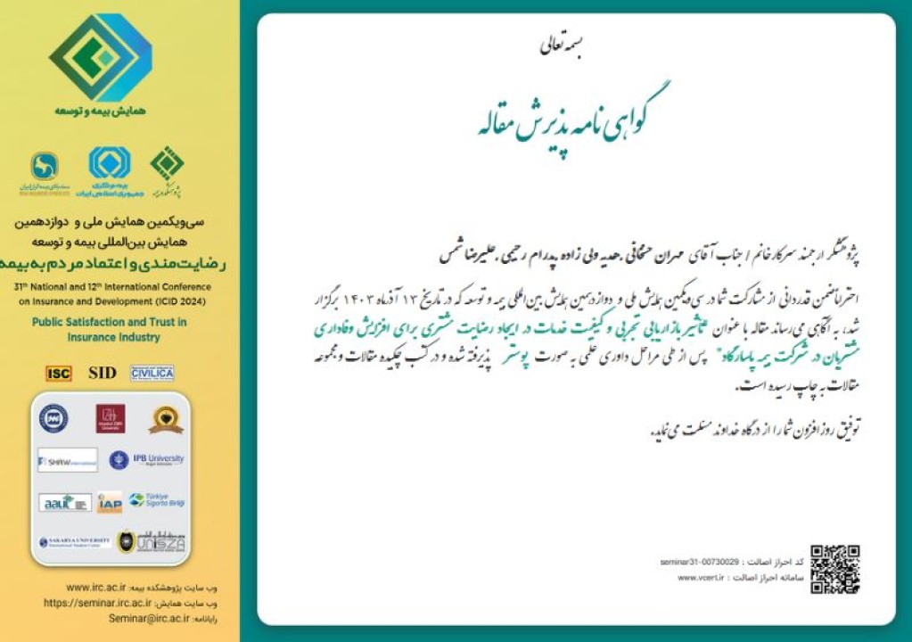 مقاله «تاثیر بازاریابی تجربی و کیفیت خدمات در ایجاد رضایت مشتری برای افزایش وفاداری مشتریان در شرکت بیمه پاسارگاد» با تلاش همکاران بیمه پاسارگاد در همایش ملی بیمه و توسعه موفق به دریافت لوح و تندیش جشنواره شد.