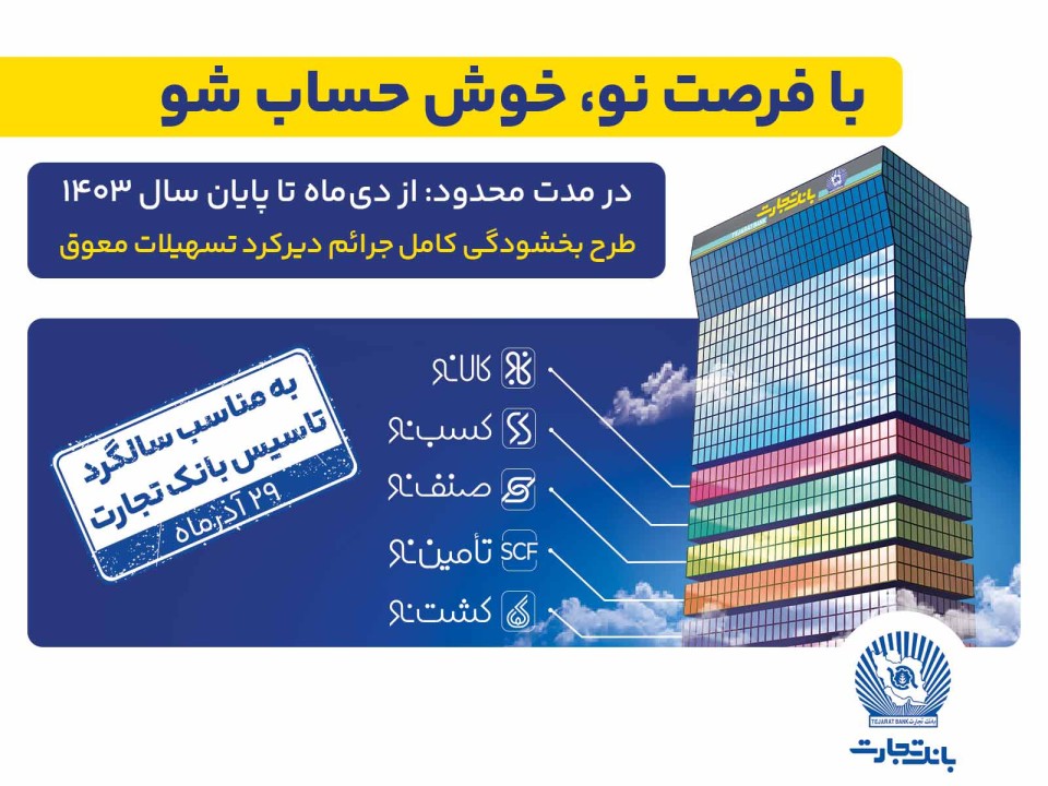 به گزارش مدیریت روابطعمومی و ارتقای سرمایه اجتماعی بانک تجارت، بسته «فرصت نو» با شعار "با فرصت نو خوش حساب شو" راهکاری است که مشتریان حقیقی و حقوقیِ دارای مطالبات غیرجاری در بانک تجارت میتوانند از تاریخ 29 آذرماه تا پایان سال جاری نسبت به تسویه بدهی غیرجاری خود اقدام کنند و از مزایای بسته فرصت نو به شرح ذیل بهرهمند شوند.