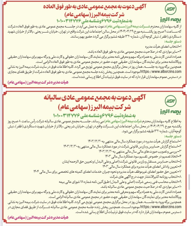 مجامع عمومی عادی سالیانه و عمومی عادی به طور فوق العاده شرکت بیمه البرز روز یکشنبه 29 تیرماه 1404 برگزار می شود.